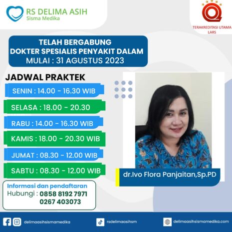 Telah Bergabung dr. Ivo Flora Panjaitan, Sp.PD (Dokter Spesialis Penyakit Dalam) Jadwal Praktek Senin :…