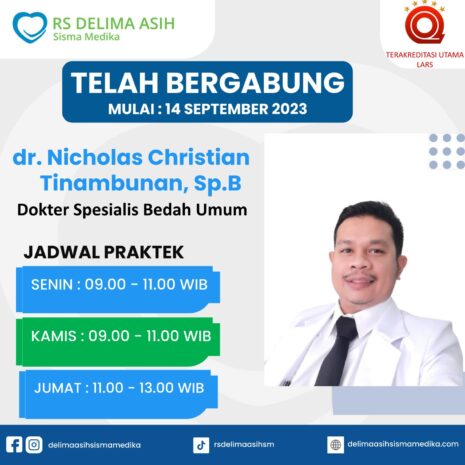 Telah Bergabung dr. Nicholas Christian Tinambunan, Sp.B (Spesialis Bedah Umum) Jadwal Praktek Senin : 09.00-11.00…