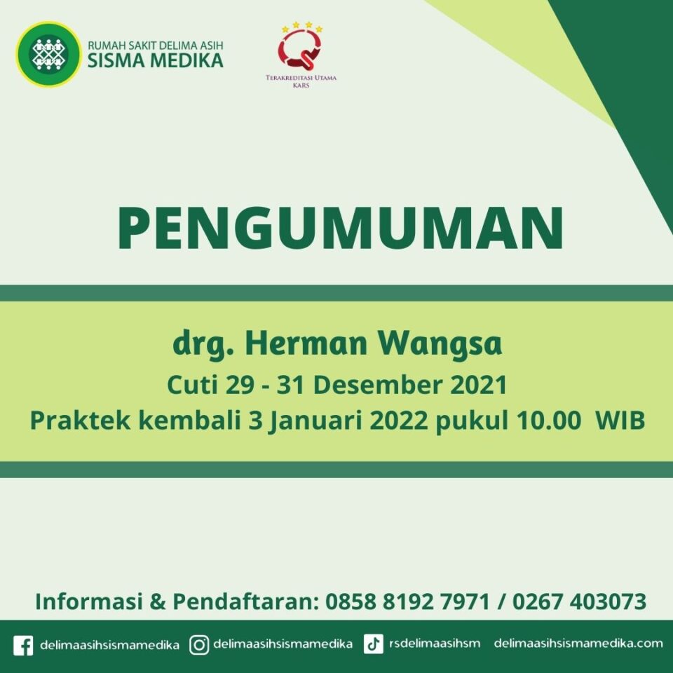 drg. Herman Wangsa cuti dan untuk sementara tidak praktek (29 – 31 Desember 2021). Praktek kembali seperti biasa pada hari Senin, 3 Januari 2022 pukul 10.00 WIB